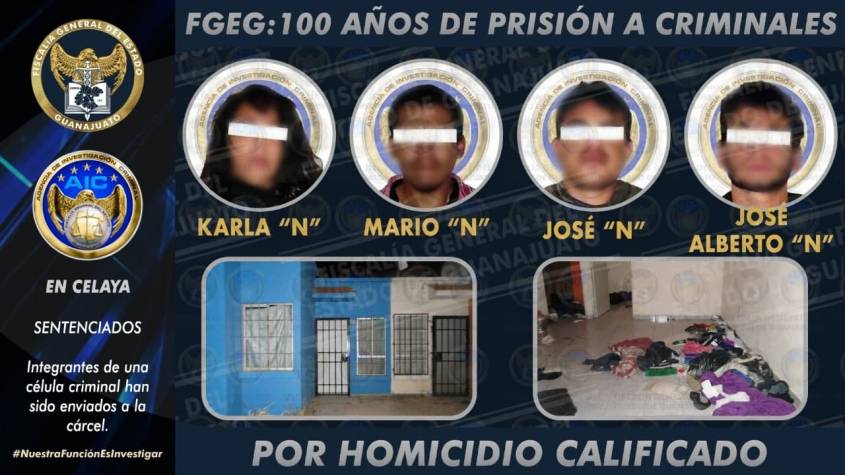 La Fiscalía Especializada en Investigación de Delitos de Alto Impacto (FEIDAI) obtuvo una sentencia ejemplar en contra de los cuatro sujetos detenidos con armas y un cadáver descuartizado en un domicilio de la colonia Campo Azul en Celaya. Los imputados deberán pasar 100 años en la cárcel, sin derecho a ningún beneficio de libertad anticipada.