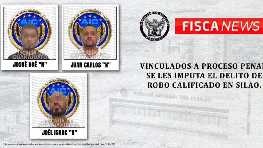 Banda de presuntos asaltantes en Silao van presos, la Fiscalía de Guanajuato presentó ante un Juez de Control a tres individuos identificados como JOEL ISAAC «N», JUAN CARLOS «N» y JOSUÉ NOÉ «N», por su presunta participación en el delito de robo calificado y obtuvo que fueran vinculados a proceso penal.