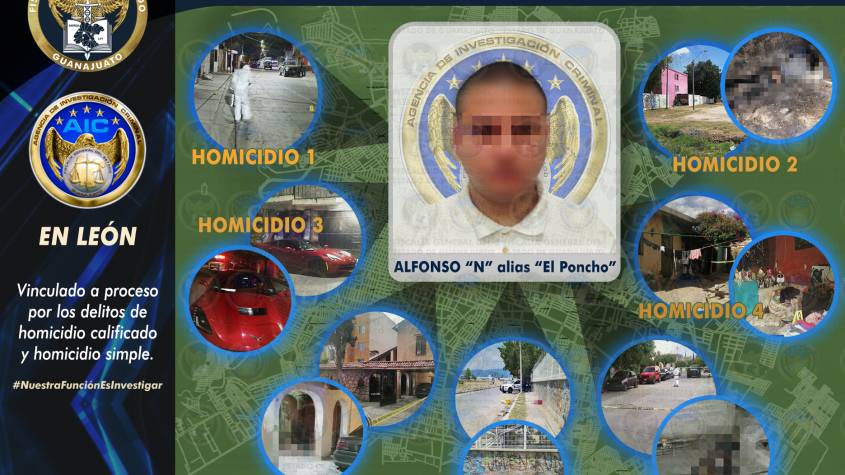 La Fiscalía General de Guanajuato logró que ALFONSO “N” alias “El Poncho”, presunto sicario de un grupo delictivo que habría participado en el homicidio de siete personas entre las que se encuentra el ex funcionario federal Napoleón “N”, Subdelegado de la SEMARNAT hasta el 2018, sea vinculado a proceso penal.
